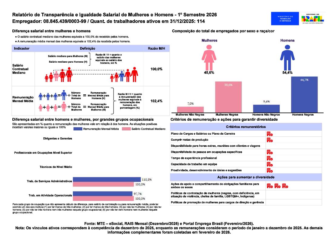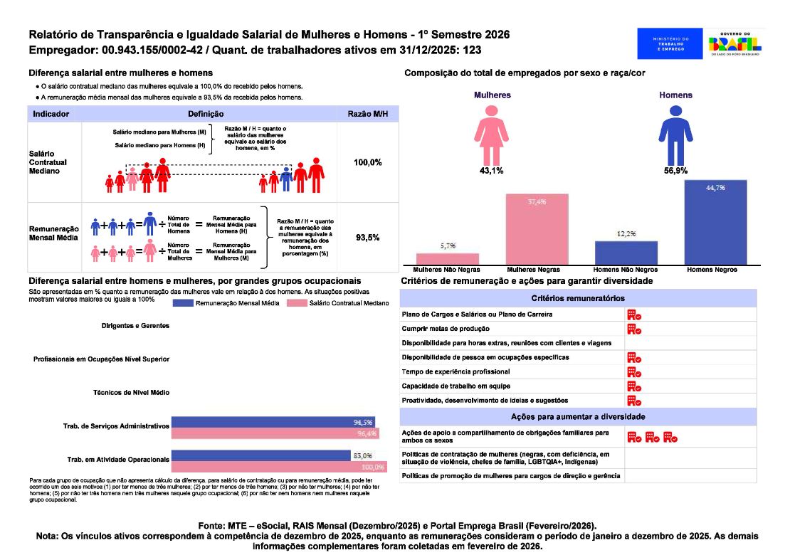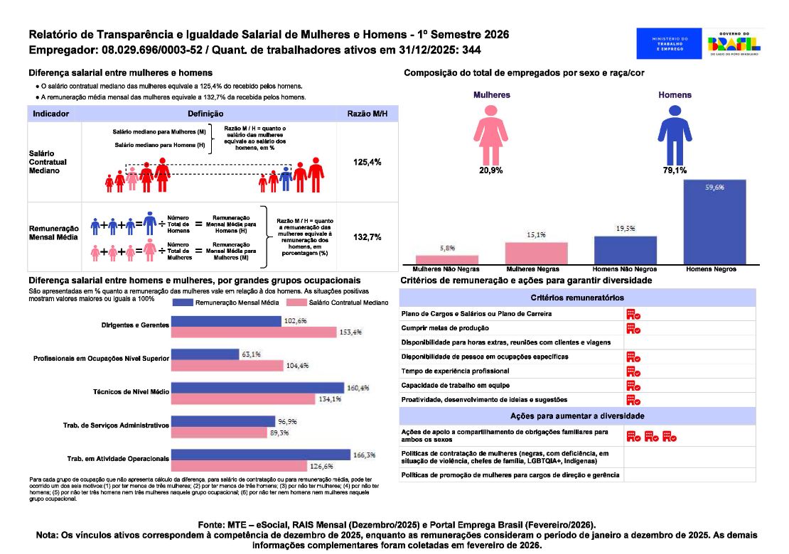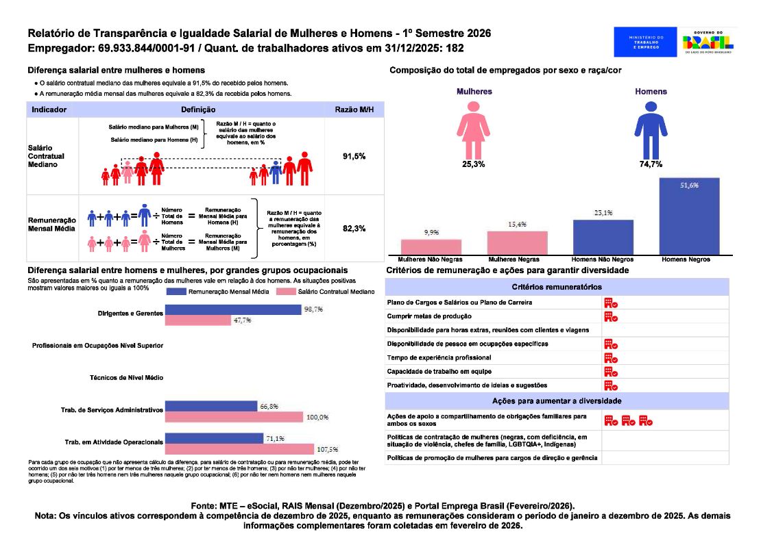 O Governo Federal por meio da Lei 14.611/23, instituiu a Lei da Igualdade Salarial, cujo relatório de transparência foi elaborado com base nos dados da RAIS do ano de 2024/2025 e E-SOCIAL 2025, tais dados são apurados por meio da remuneração média de homens e mulheres levando em consideração todas as funções da empresa.